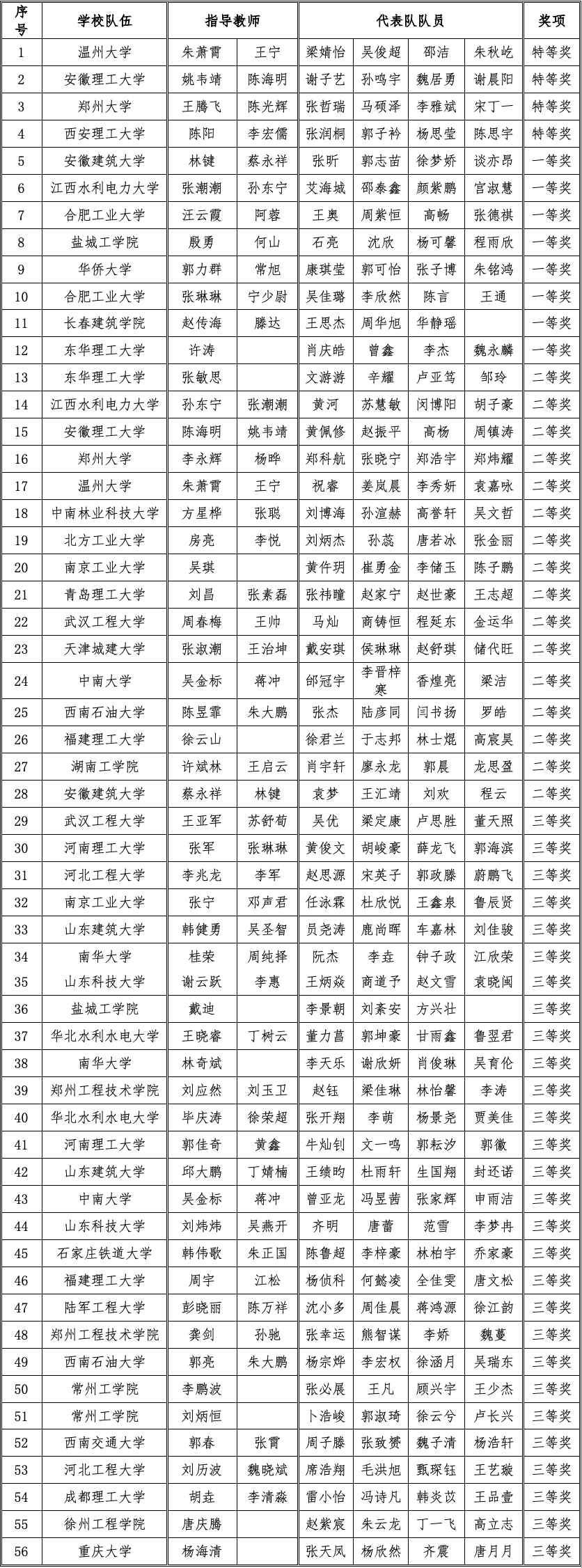 为培养城市地下空间工程专业大学生的创新精神、团队合作精神,提升大学生的实践动手能力与综合素质,加强大学生相互学习、交流,为优秀创新人才脱颖而出创造条件,经报中国岩石力学与工程学会同意,2025年11月14日-16日在江西水利电力大学举办了第九届高校城市地下空间工程专业大学生模型设计竞赛,本次竞赛的主题为“双层双跨地下空间结构模型设计”。共有来自全国47所高校的81支城市地下空间工程专业及土木工程(岩土方向)专业的学生代表队报名参加了此次比赛,经过激烈角逐,温州大学等高校4支参赛队获得特等奖,安徽建筑大学等高校8支参赛队获得一等奖,东华理工大学等高校16支参赛队伍获得二等奖,武汉工程大学等高校28支参赛队伍获得三等奖。现予以通报表彰,希望以此次竞赛为契机,充分发挥示范效应,进一步提高城市地下空间工程专业教学水平和人才培养质量。