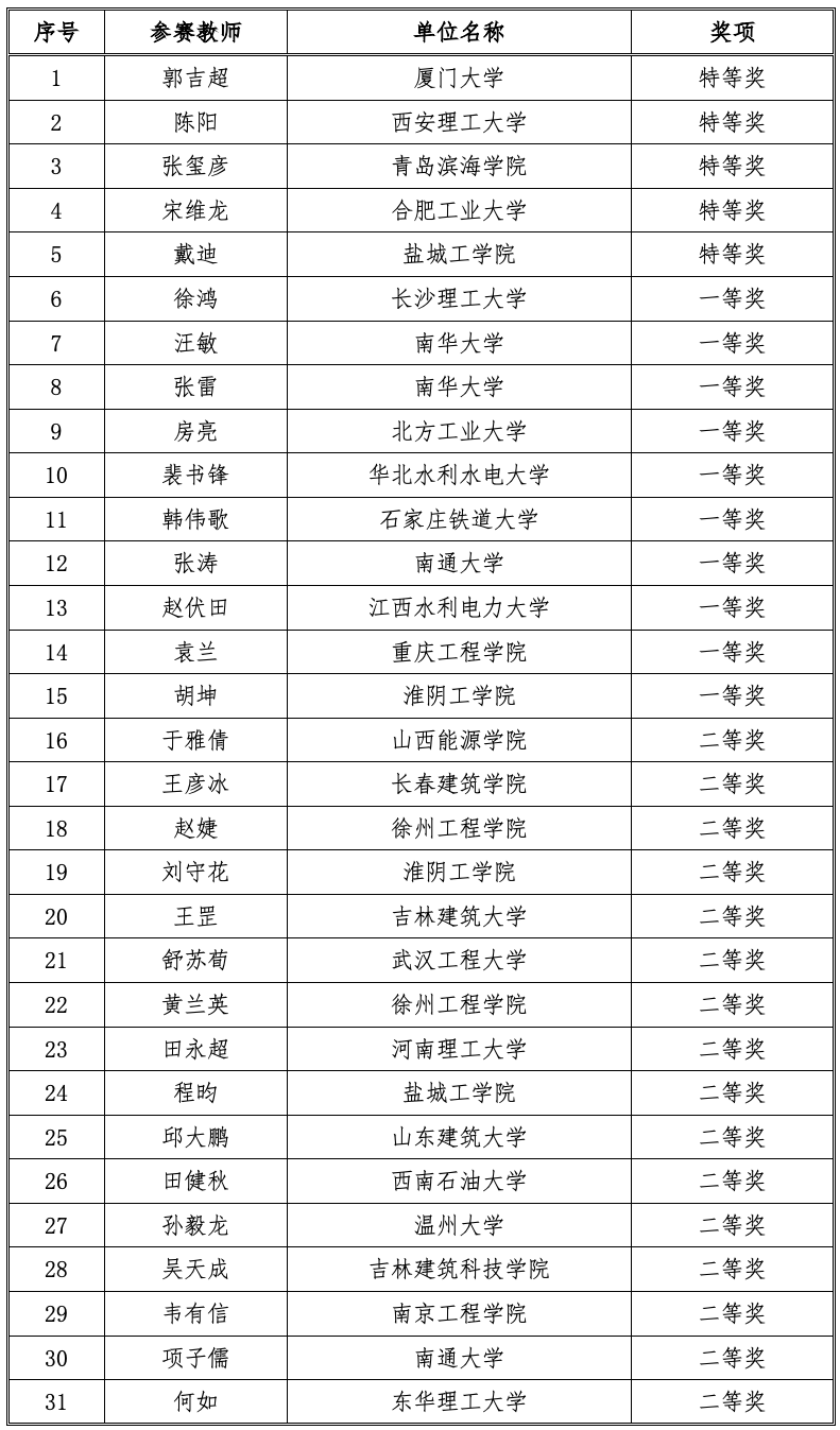 为提高城市地下空间工程专业教学质量,调动广大青年教师的教学积极性和创造性,加强青年教师间的相互切磋和共同提高,促进教学内容、教学方法和教学手段的改革,经报中国岩石力学与工程学会同意,依据《高校城市地下空间工程专业青年教师讲课竞赛须知》(试行),2025年11月15日-16日在江西水利电力大学举办第九届全国高校城市地下空间工程专业青年教师讲课大赛。在比赛中来自全国40所高校的58位城市地下空间工程专业青年教师,分为5个竞赛组参加讲课比赛,经过激烈的角逐,依照《竞赛须知》的规定,共有5名分别来自厦门大学、西安理工大学、青岛滨海学院、合肥工业大学、盐城工学院的青年教师荣获特等奖;10名青年教师获得一等奖;16名青年教师获得二等奖。现予以通报表彰,希望借此充分发挥优秀青年教师钻研教学的示范带动效应,进一步提高城市地下空间工程专业青年教师的教学水平,推动人才培养质量提升。