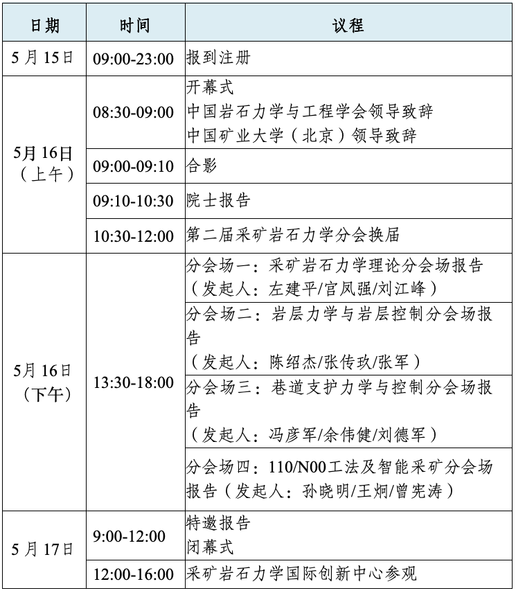 为推进煤矿科学开采与新质生产力的高质量协同发展,秉承“安全、绿色、智能”的理念,促进煤矿开采领域的理论创新、技术发展、装备升级、产业提升,经研究决定由中国岩石力学与工程学会主办,中国岩石力学与工程学会采矿岩石力学分会和中国矿业大学(北京)承办,定于2026年5月15-17日在北京召开2026年采矿岩石力学与岩层控制学术大会。现将有关事项通知如下: