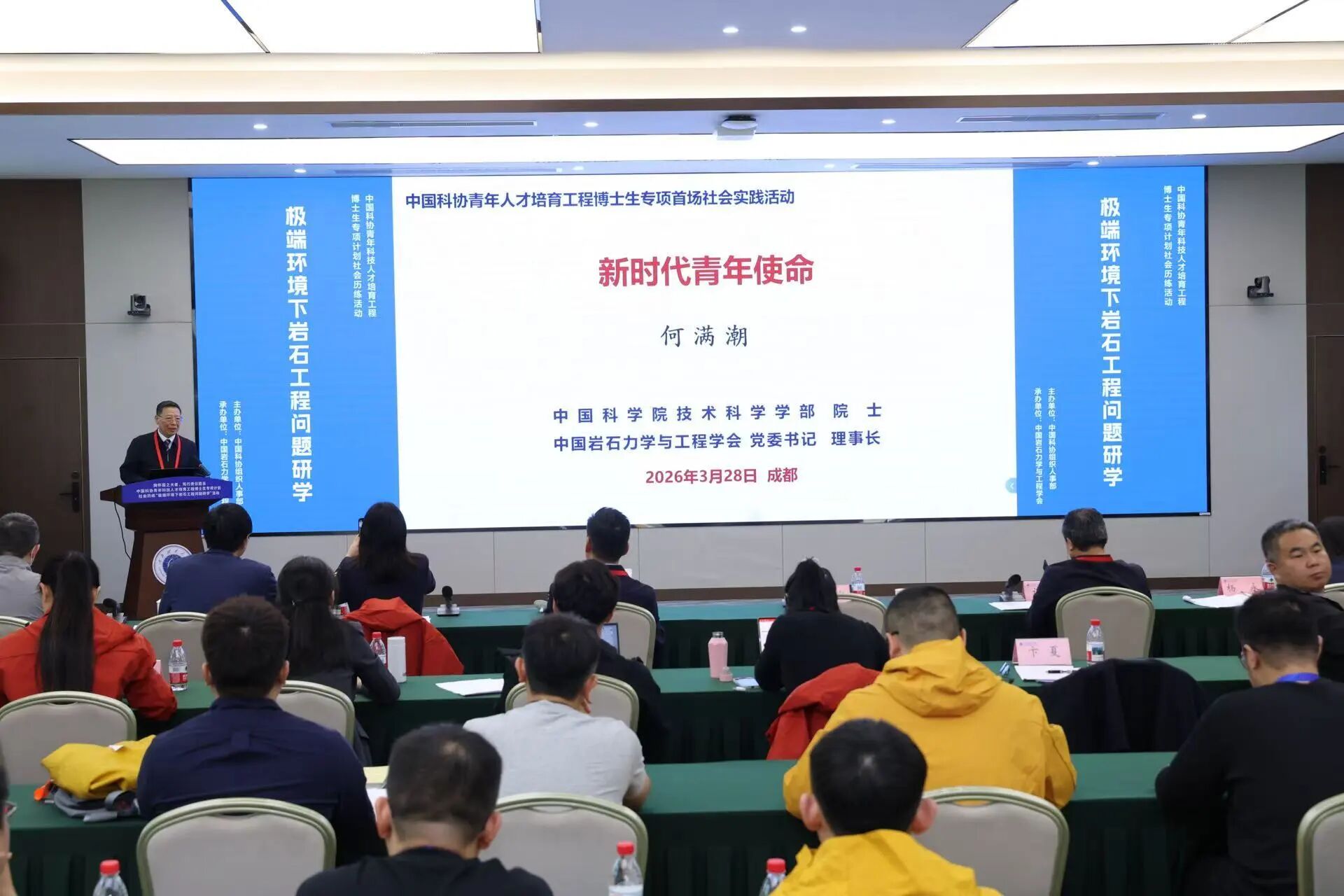 3月29日下午,中国科协青年人才培育工程博士生专项首场社会历练活动—“极端环境下岩石工程问题研学”在成都扬帆起航。开班仪式上,成都理工大学成立中国岩石力学与工程学会首个学生分会。 中国科协组织人事部、四川省科协、成都市科协等相关负责同志到会指导,《瞭望中国》杂志社荣誉社长秦清润、中国国际文化交流基金会爱国主义教育基金管理委员会相关负责人应邀参会,中国科学院院士、中国岩石力学与工程学会党委书记、理事长何满潮出席活动并发布重要讲话,学会副理事长、成都理工大学校长许强教授,ISRM中国国家小组副主席范宣梅教授、刘春教授、聂雯教授等出席活动。开班仪式由中国科协培训和人才服务中心王洪建教授主持。 何满潮院士在致辞中强调,青年是科技创新的中坚力量,是冉冉升起的朝阳。他表示,学会始终将青年人才培育工作置于重要位置。本次活动正值“科技三会”召开十周年,当前国际环境复杂多变,以科技创新破解“卡脖子”难题尤为迫切。在“十五五”规划开局的关键节点,面对日益激烈的国际科技竞争与越发艰巨的核心技术攻关任务,我们必须坚持走自主创新之路,加速实现高水平科技自立自强。成立学生分会,是学会落实创新驱动发展战略、强化青年人才培养的重要抓手。他勉励广大青年科技工作者既要厚积学识,更需深悟科学本质,在极端环境工程、国产工业软件研发等关键领域勇担重任,为赢得科技竞争、实现国家高水平科技自立自强贡献青春智慧与力量。