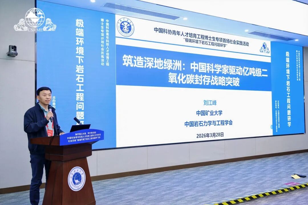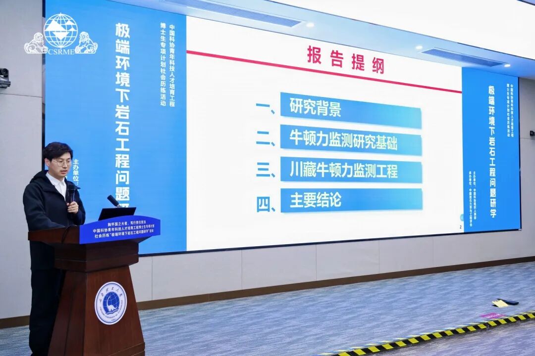 中国矿业大学刘江峰教授以《筑造深地绿洲:中国科学家驱动亿吨级二氧化碳封存战略突破》为题,系统阐述了我国在深地工程与二氧化碳地质封存领域取得的重大进展。同济大学任树林博士在题为《川藏铁路工程中的牛顿力监测》的报告中,详细介绍了重大工程实践中牛顿力监测技术的原理与应用优势,生动展示了青年科技工作者面向国家重大战略需求开展科研攻关的使命感与担当。 中国科协博士生专项社会历练试点活动,是面向青年科技人才开展培育工作的重要载体。本次“极端环境下岩石工程问题研学”活动聚焦国家重大战略需求,围绕极端环境下岩石工程领域的重大科学问题与工程问题,通过现场交流和实践考察的形式,引导青年学者走进工程一线、了解国家需求、感悟科技使命、提升实践能力,自觉承担科技强国使命,努力成长为堪当民族复兴重任的高层次科技人才。 本次活动由中国科协培训和人才服务中心主办,中国岩石力学与工程学会承办,成都理工大学、西藏农牧大学协办。作为学会首个学生分会,成都理工大学将依托该平台,常态化开展学术交流、工程实践、跨校合作等活动,为全国高校岩石力学领域青年人才培养提供可复制、可推广的经验。