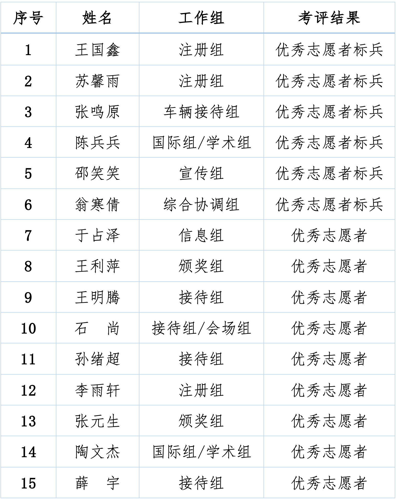 经各工作组长推荐,大会组委会主席批准,现决定授予王国鑫等6位志愿者“优秀志愿者标兵”称号,授予于占泽等9位志愿者“优秀志愿者”称号,以兹鼓励。