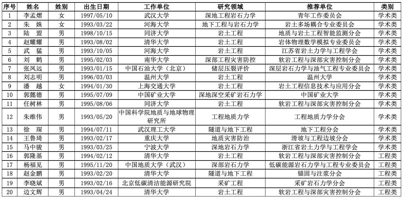 中国岩石力学与工程学会第十一届青年人才托举工程项目被托举人评审结果的公示