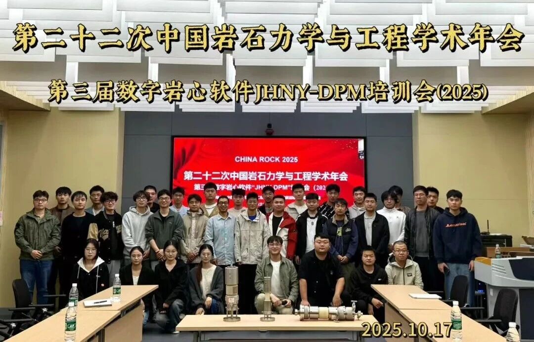 2025年10月17日,在China Rock 2025 第二十二次中国岩石力学与工程学术年会期间,由中国岩石力学与工程学会和国际地质灾害与减灾协会共同主办,中国矿业大学承办的“数字岩心软件JHNY-DPM培训班”在徐州成功举办。本次培训采取线上+线下模式,吸引了来自北京大学、北京科技大学、北京师范大学、东北大学、深圳大学、安徽理工大学、中国矿业大学等21家单位的107名学员(线下40名)参加。
