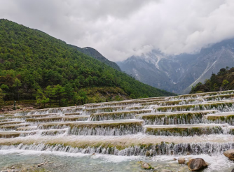 玉龙雪山蓝月谷,宛如一幅天然的水墨画,鱼鳞坝则是这幅画卷中独具魅力的点睛之笔。鱼鳞坝以其独特的石块排列形态,宛若铺展的鱼鳞,展现了大自然在地质力学作用下的奇妙造化。这里,冰川融水汇聚成碧蓝的湖泊,水流在鱼鳞状的坝体上层层叠叠,形成了一个天然的水利工程,彰显了岩石力学与水文地质的完美结合。